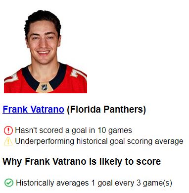 The green check marks for average shots per game, average power play time on ice per game as well as recent performance are only shown if they are greater than an average high production player. This means everything is going right for the player other than physically scoring a goal. You can also see the player is exceeding his average scoreless streak while maintaining these stats. It's time to score!