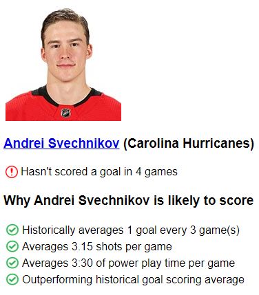 The more green check marks the better, but somtimes you might notice yellow alerts indicating a player is producing less than in previous seasons. This warning is not suggesting you hold back a wager, it is merely an indication of low player momentum. A player in this situation will appear on the predictions list beginning much later into a scoreless streak